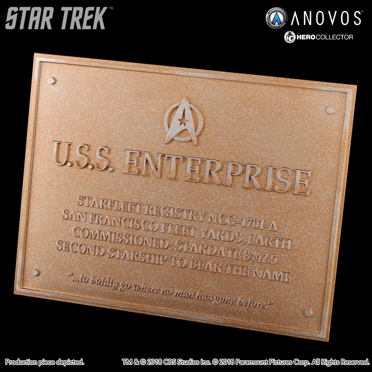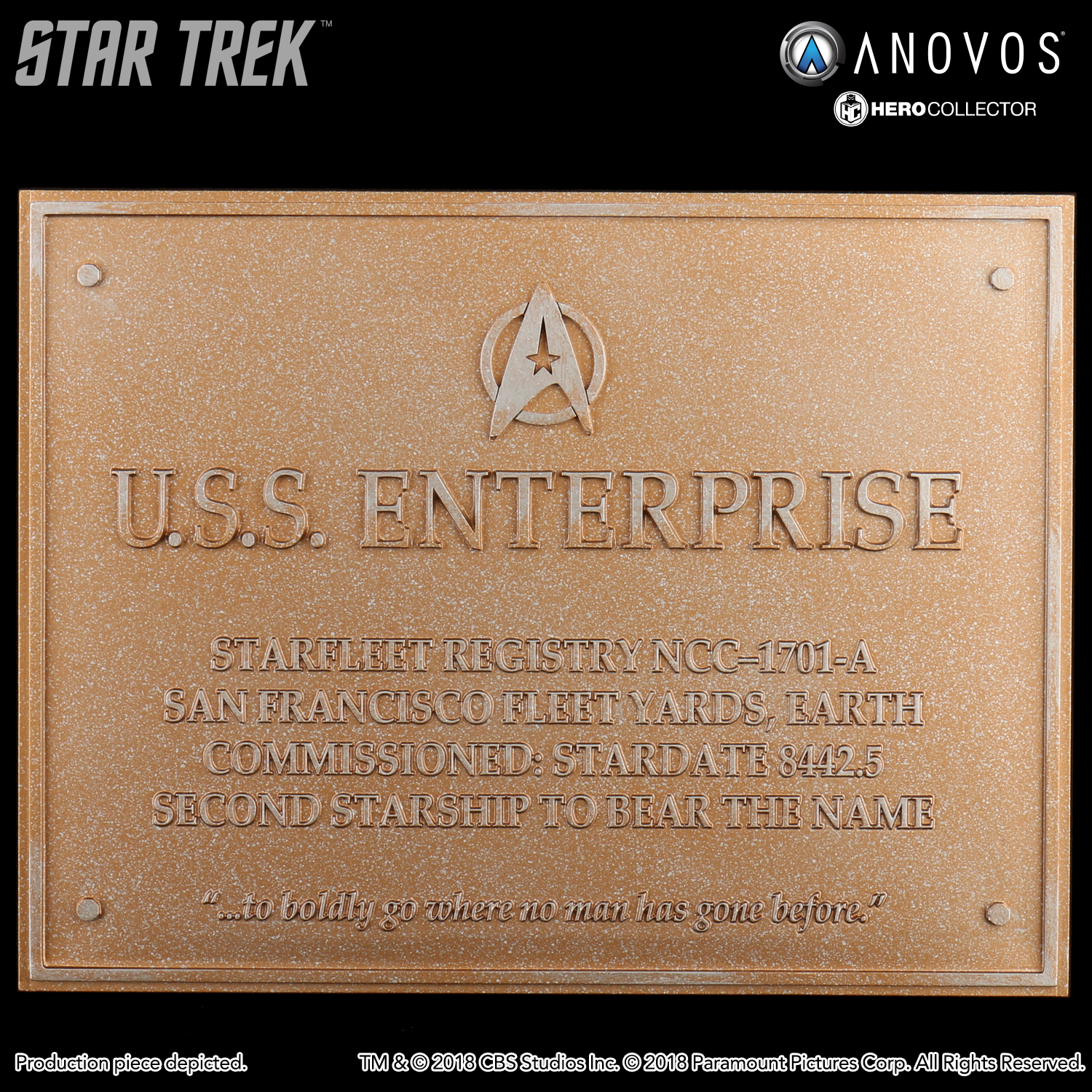 This replica dedication plaque features polyresin construction, germane details of the ship's place of construction, and the ship's motto from the first human to build and successfully test the warp drive, Zefram Cochrane.